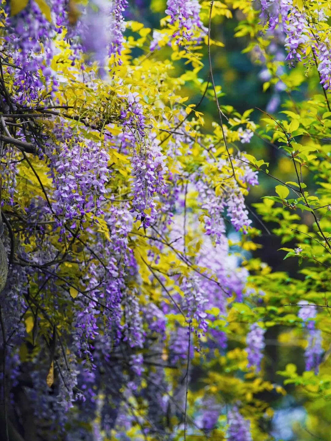 当双龙田园的黄花风铃木刚刚褪去金黄,桂湖公园里,500多年树龄的“中国藤王”紫藤便接过了这场春日接力——串串淡紫色花穗垂挂如瀑,暗香浮动,将这座明代古典园林染成一片梦幻的紫色。